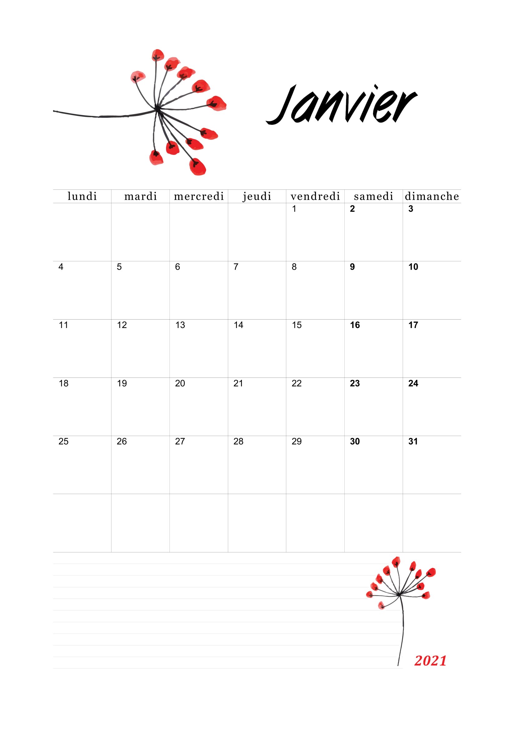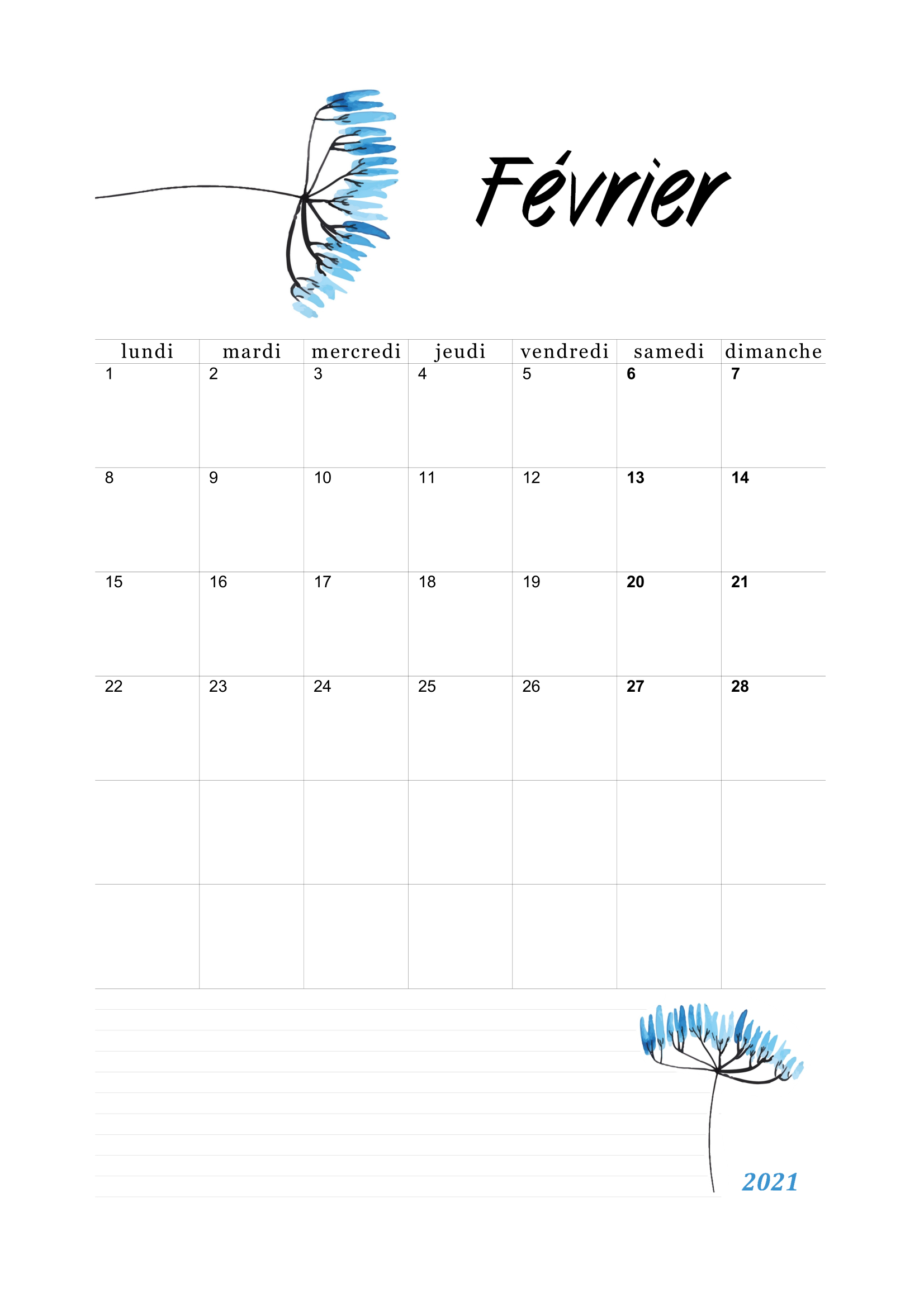Imprimez un calendrier mensuel 2021 (gratuit), des modèles à télécharger chaque mois au format pdf et des images en a4 / a5.